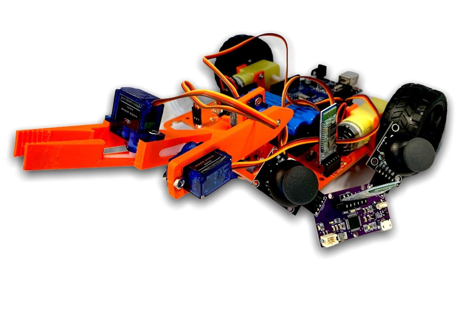 In level 4 students add a robotic arm to their robot and learn more about the kinematics of robotic arm and control the robot and the arm using wireless communication.